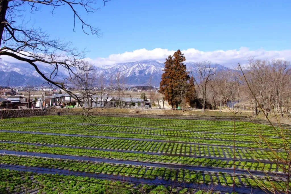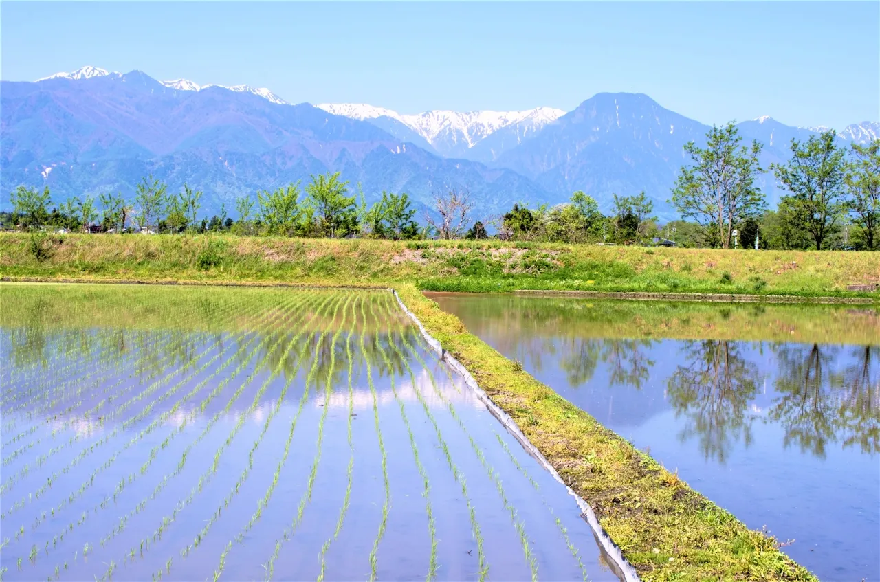 田植えに向けて水が張られる春の時期は、水面に残雪の北アルプスが映る「水鏡」と呼ばれる光景が見られるほか、「大王わさび農場」ではわさびの花が見られるなど、見どころがいっぱい。安曇野を象徴する絶景に出会えますよ。