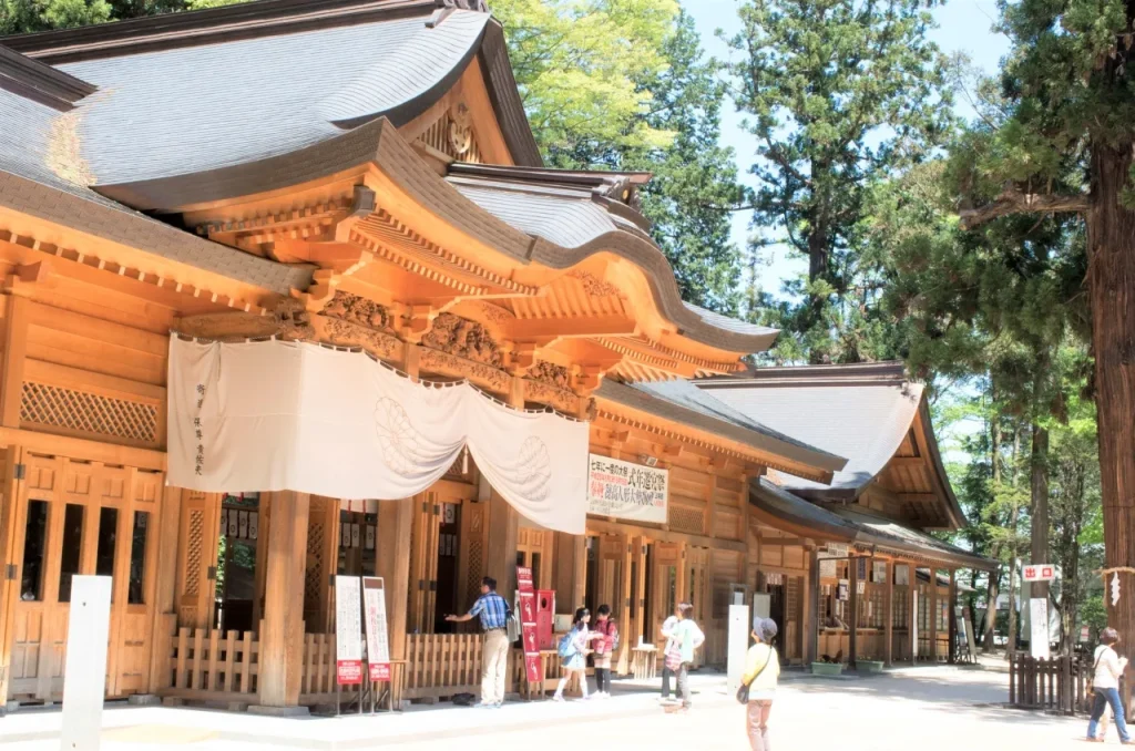 穂高駅から500mほどの穂高神社は、1,000年以上前から安曇野に建つ歴史のある神社。交通安全や産業安全の守り神として日々多くの参拝者を集めており、近年ではパワースポットとしても人気があります。