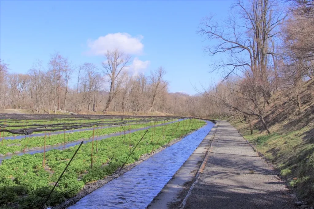 農場の中心部では、湧水の中でわさびが栽培されているのが見られます。