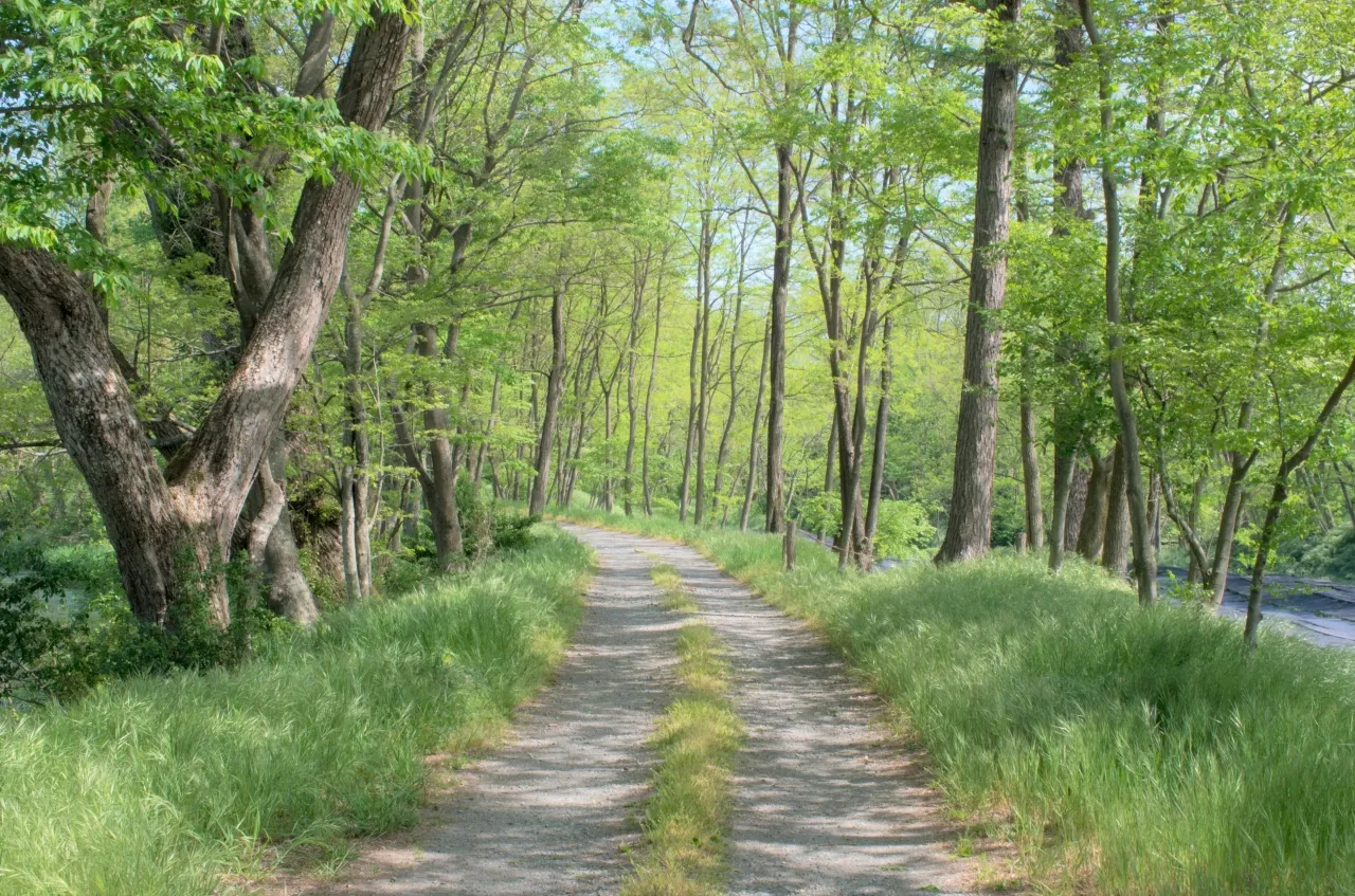 約2kmの未舗装の小路は交通量も少なく、静かなサイクリングが楽しめますよ。周囲を覆う木々の木漏れ日や川のせせらぎを感じながら、軽快に自転車をこぎ進めましょう。