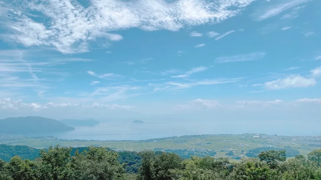 高台から見る琵琶湖は、その広大な湖面と周囲の山々のコントラストが相まって美しい景観を生み出します。その壮大さには感動することでしょう。