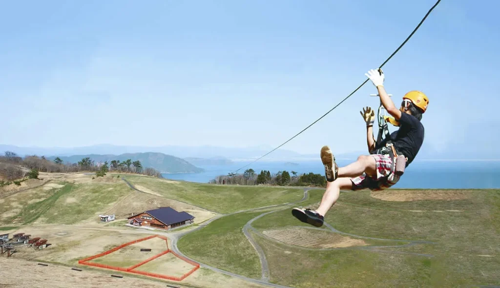 山頂から伸びるワイヤーロープを滑車で滑り降りる空中アトラクションは、まるで自由に空を飛んでいるようなスリルと爽快感が楽しめます。