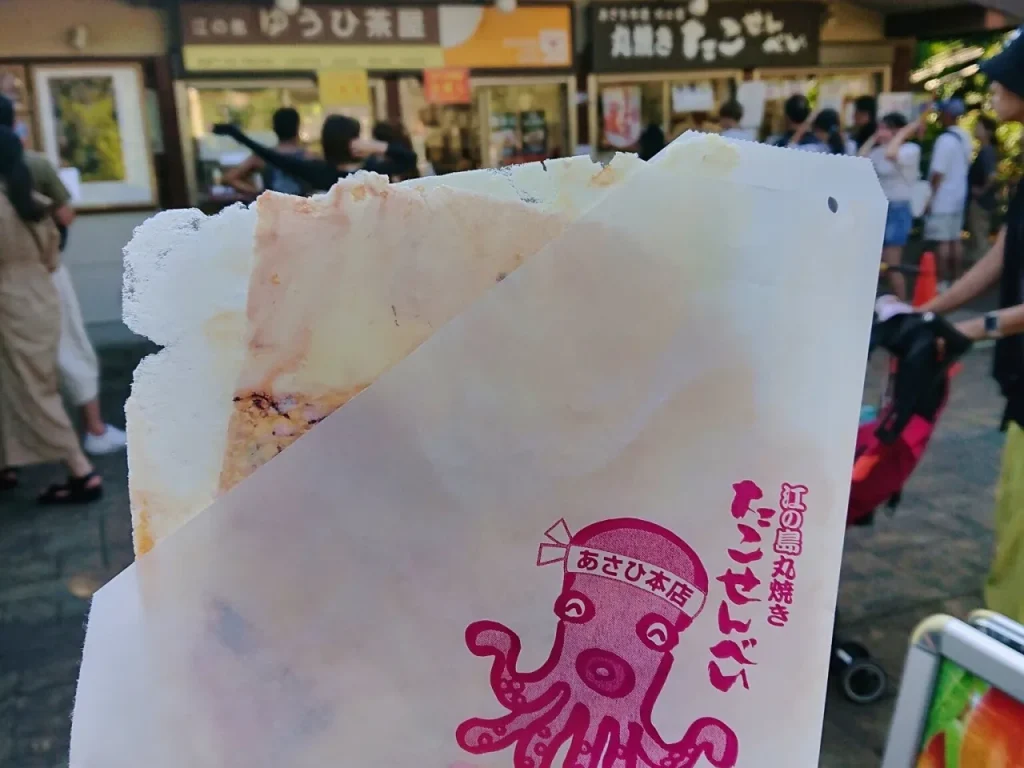 江島神社へ続く商店街の途中にある「あさひ本店」さんでは、たこを2〜3匹まるまるプレスした巨大な「丸焼きたこせんべい」がいただけます。
