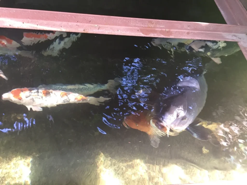 清らかな水の流れる音と鯉たちの彩りで涼やかでしたが、なにやらこちらに近づく黒い影が。その正体は、観光客がくれるエサを食べ過ぎたのであろうぽっちゃり鯉でした。