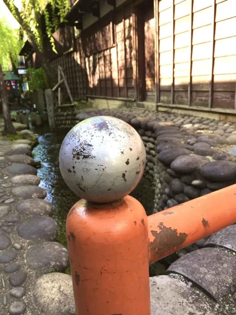 水路に架かる橋の装飾にまで丸みのある、やなか水のこみち。パートナーと郡上八幡で写真を撮るなら、この可愛らしいこみちがおすすめ。