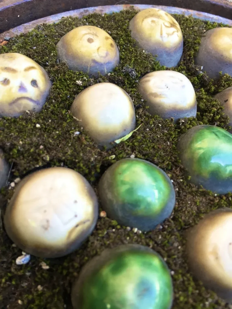 こみちをよく見ると、顔の描かれた小さな石を見つけられます。