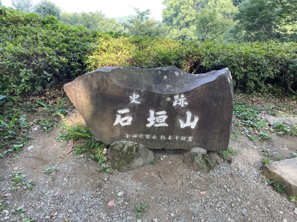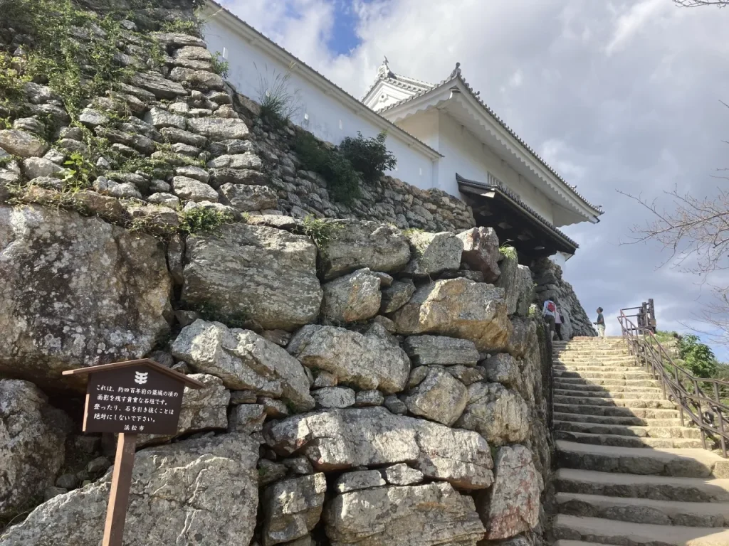 道中には、約450年前の石垣が今も残っており、大きな岩を粗く積み上げた「野面積み(のづらづみ)」の技法が見られます。その歴史ある石垣を眺めながら、ゆるやかな坂道や石の階段を進んでいくのも楽しみのひとつです。