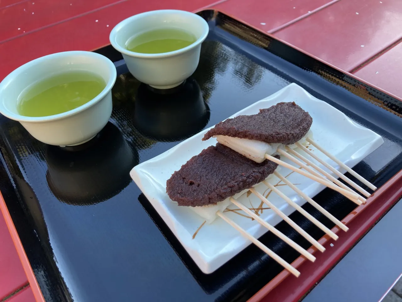 お守りを選んで二人の願いを込めた後は、法多山に訪れたらぜひ味わってほしい名物の厄除け団子をいただきましょう。