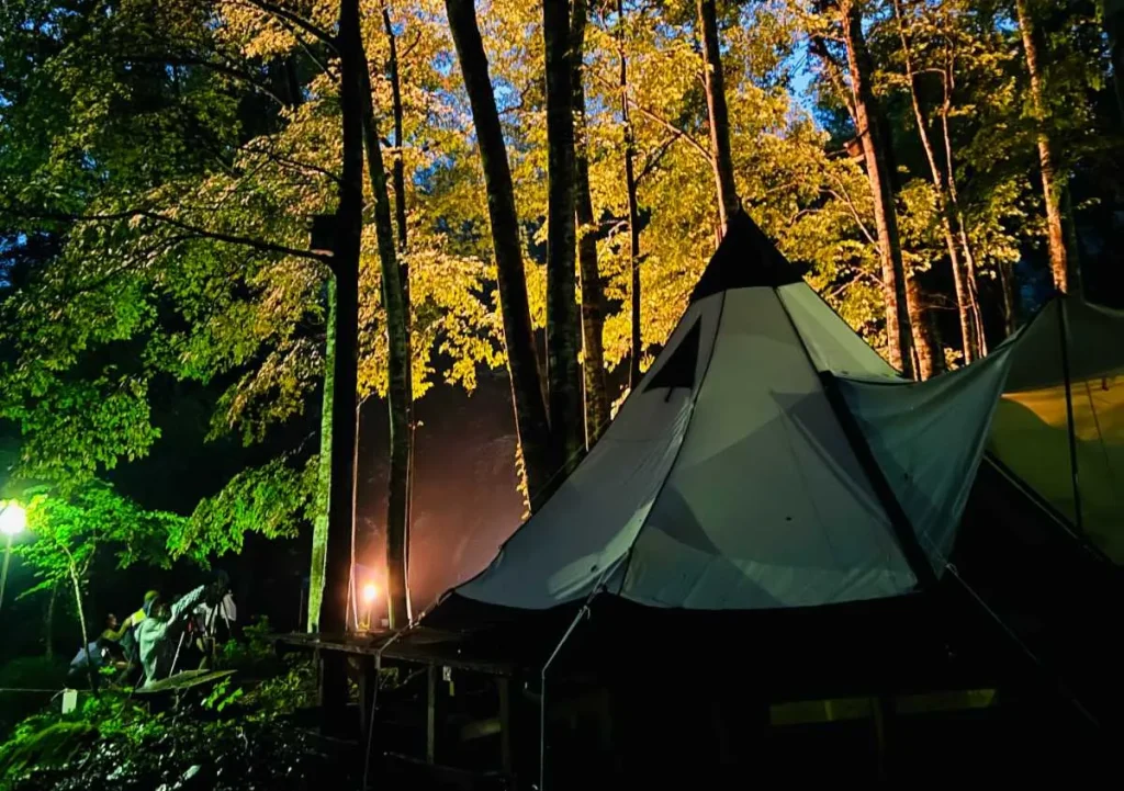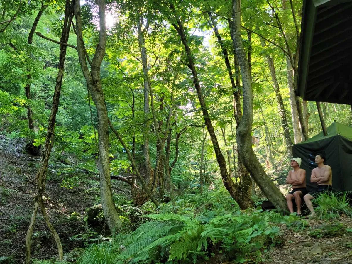 檀原さん:まずは渓流サウナです。薪を使ったフィンランド式のテントサウナであたたまったら、渓流で冷水浴、その後はブナ林の中で外気浴が楽しめます。ふる里の森が持つ大自然を五感で体験していただけますよ。