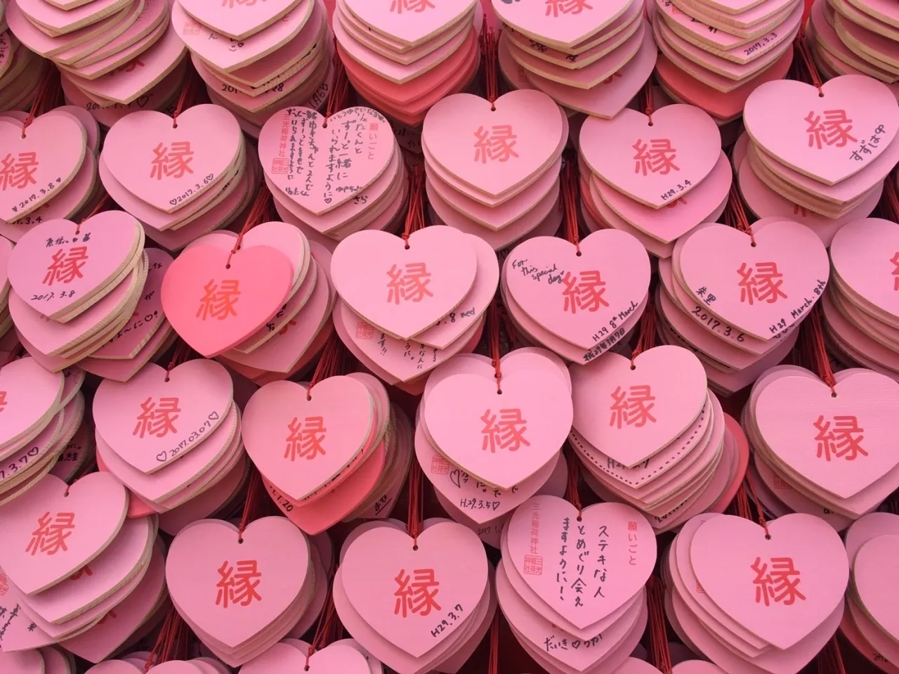 真っ赤な鳥居が続く通りを抜けると見えるハートの絵馬。こんなに可愛らしい神社は全国を探しても有数でしょう。特徴的なハートの絵馬を背景に、記念写真を撮影するのは鉄板です。
