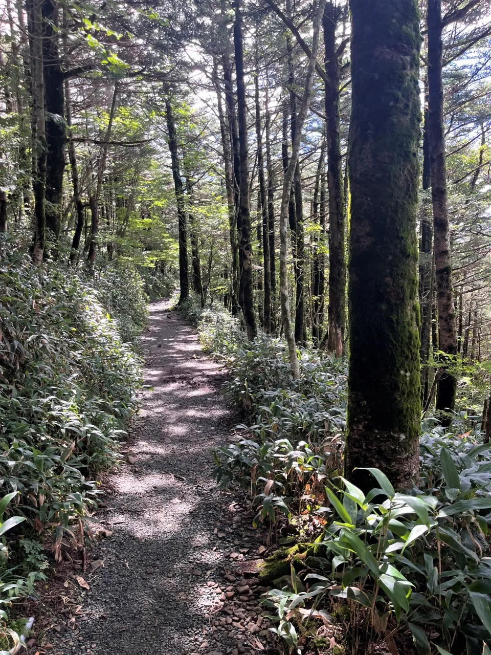 登山道に入ってからしばらくは木立の中の緩やかな道を進みます。木々の間から時折姿を見せる石鎚山の山頂や、瓶ヶ森(かもがもり)をはじめとする周囲の山々を眺めながら歩きましょう。