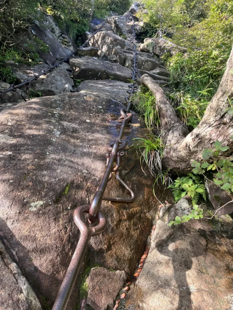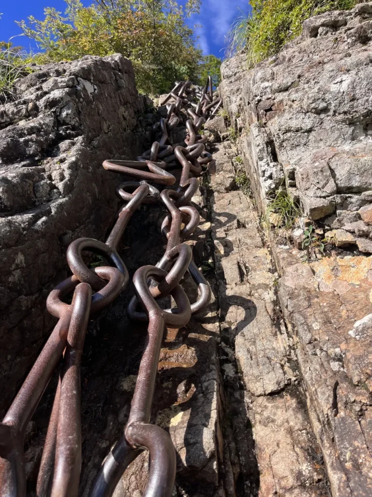 鎖場では、鎖を頼りに数十メートルの垂直の崖を登ります。非常に高度感があり、高所の苦手な方にはおすすめできません。
