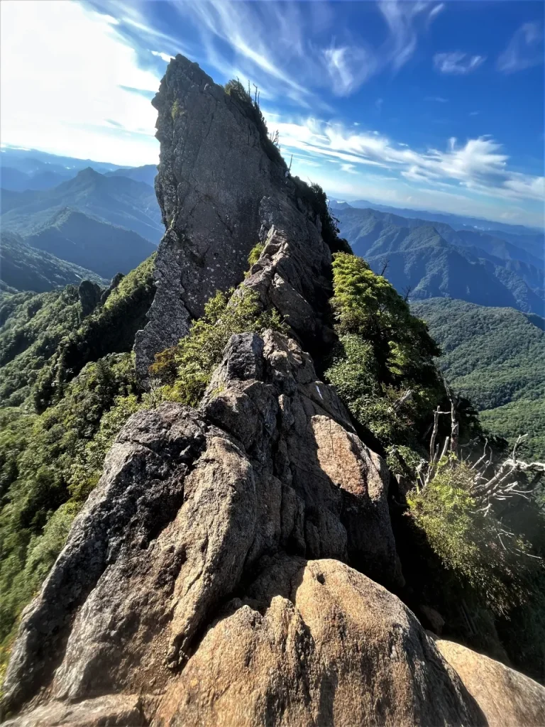 弥山から天狗岳へ続く稜線では、スリリングな岩場歩きが楽しめます。鋭く切れ落ちた尾根上を歩くため、思わず足がすくみますが、ゆっくりと慎重に歩を進めましょう。