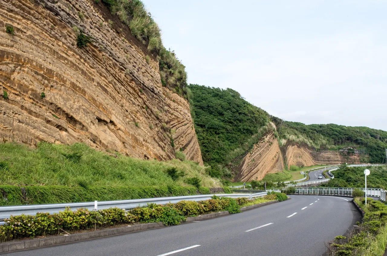 島西部で見られる地層切断面は、島一周サイクリングの最後の見どころ。美しい曲線を描く地層がバームクーヘンのように何重にも重なる光景は、見る人を驚かせます。