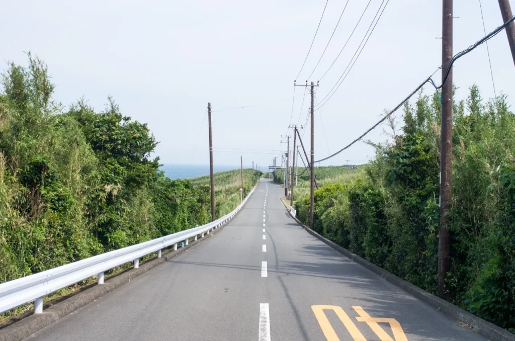 元町港から海沿いのサイクリングロードをしばらくすると、右手に大島空港が見えてきます。滑走路下のトンネルをくぐり、大島一周道路に合流、そのまま北東をめざしましょう。