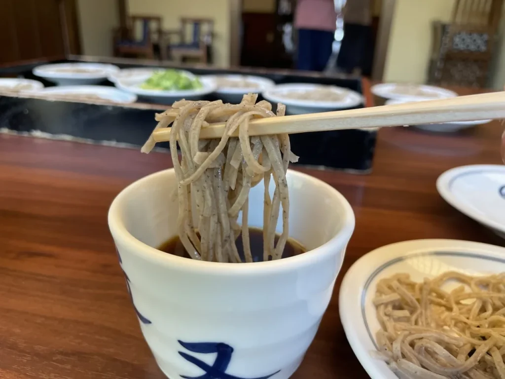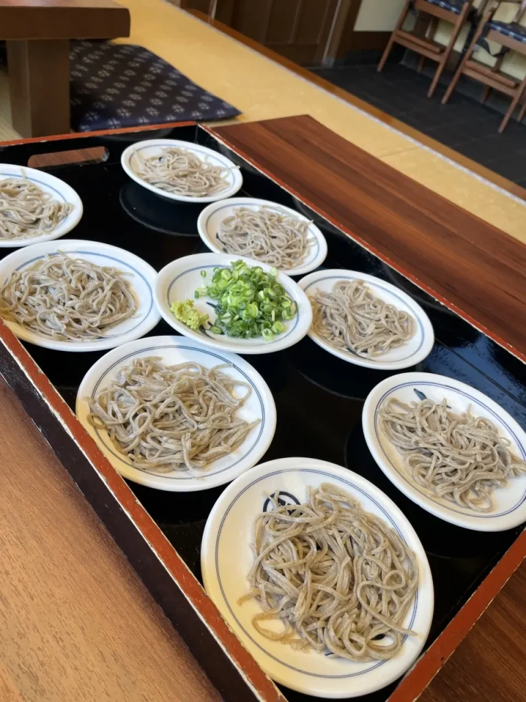 辰鼓楼のすぐ近くにある近又は、江戸時代から続く老舗の蕎麦屋さん。自家製粉の蕎麦粉を使って手打ちした蕎麦はコシと喉越しの良さが特徴で、出石焼のお皿に1口分ずつ乗った状態で提供されます。