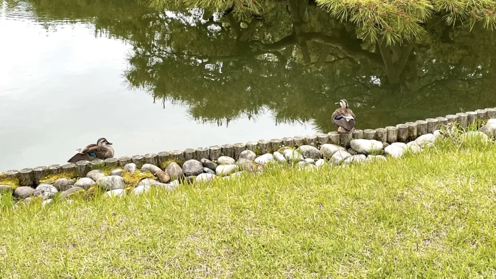 唐崎松の下でカルガモに遭遇。パートナーと一緒に観察して癒されました。