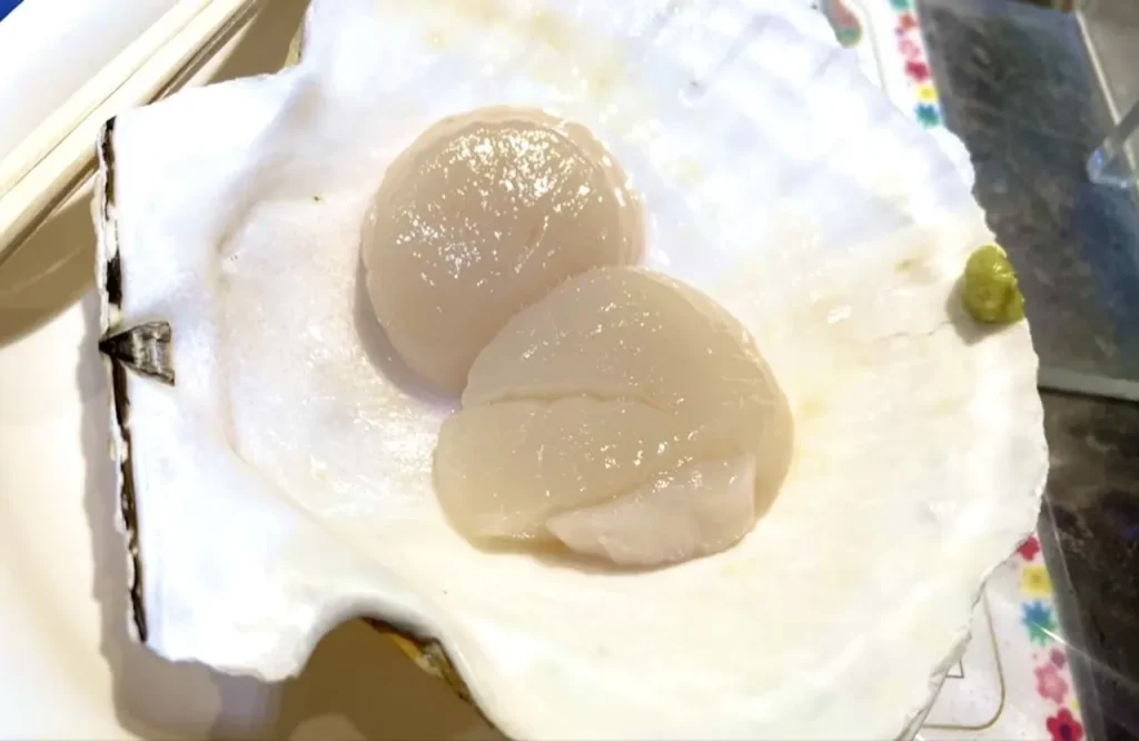 筆者が食べたのはホタテ。皿代わりの貝殻に醤油を垂らし、添えられたワサビをつけてご賞味ください。