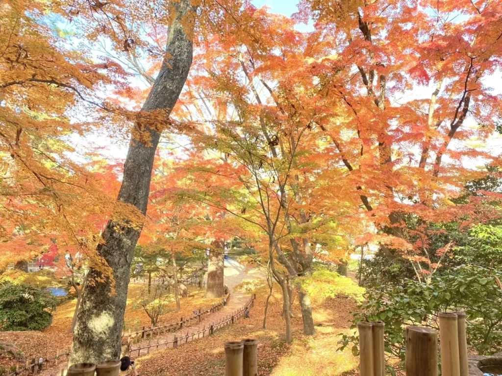 総面積約11.4ha、回遊式も取り入れられた広大な土地の兼六園には、160種の樹木が8,200本も植えられています。紅葉が澄んだ秋空を燃やすような迫力には、圧巻のひとことです。
