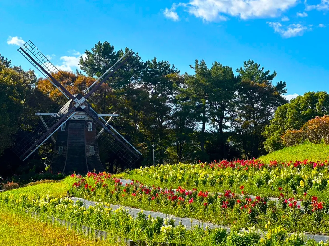風車の近くには四季折々の花が咲き誇る花壇があり、春にはチューリップ、夏にはひまわりやラベンダーなどが楽しめます。また風車がたたずむ芝生広場のまわりには桜の木が植えられているため、春にはあたり一面の桜並木が、秋には綺麗な紅葉が楽しめます。