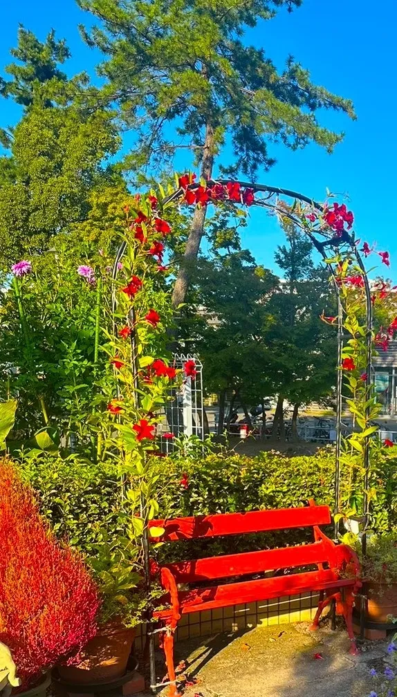 赤色のベンチと薔薇のアーチが可愛いため、大切な人と一緒に座りながら、思わず写真を撮りたくなりますね。