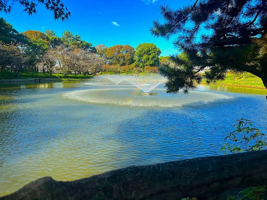 おふけ池の噴水は常に水が出ているため、タイミングが良ければ、虹の架け橋が撮影できます。またおふけ池の近くには桜の木が植えられているため、お花見シーズンには絶景の桜並木を見られるでしょう。