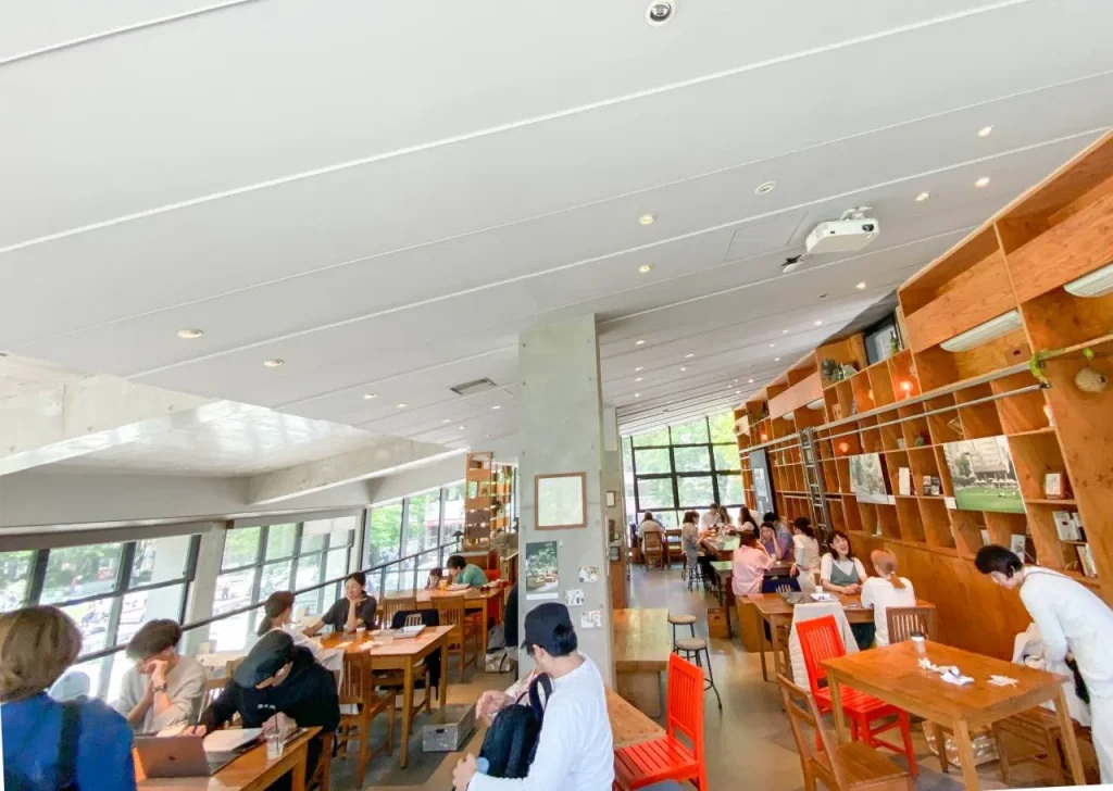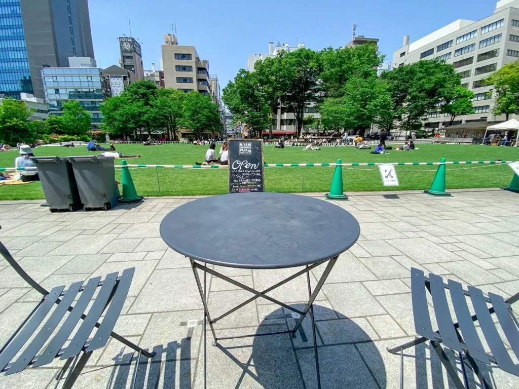 その理念通り、園内の2,500本の草木や芝生以外にも座れるテーブル席、桜の木の下にある階段状のウッドデッキなど、居心地の良いスペースが用意されています。
