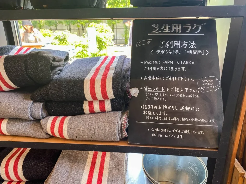 一年中芝の緑が保たれており、芝の質は柔らかく、チクチク感も感じません。芝生に敷くゴザは園内で無料で貸し出しされるほか、園内のカフェではラグも貸し出しされています。