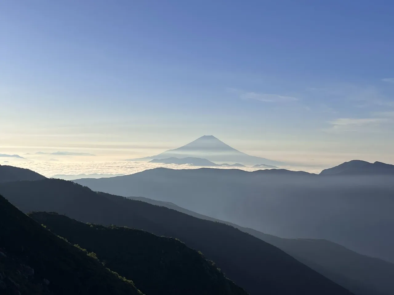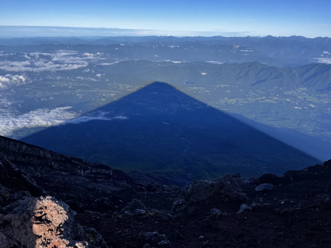 奥宮から西に進むと、本栖湖や精進湖など、山梨側の絶景が堪能できます。運が良ければ富士山のシルエットが雲海やふもとに向けて伸びる「影富士」が見られることもあります。限られた条件下でしか見られない貴重な絶景ですよ。