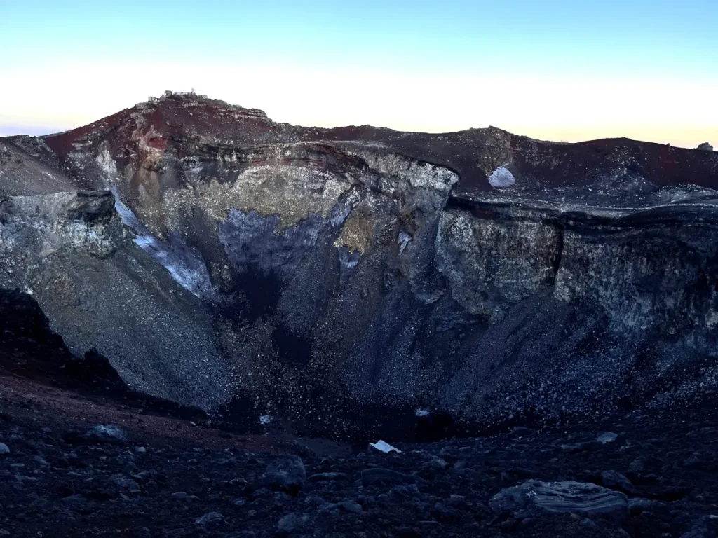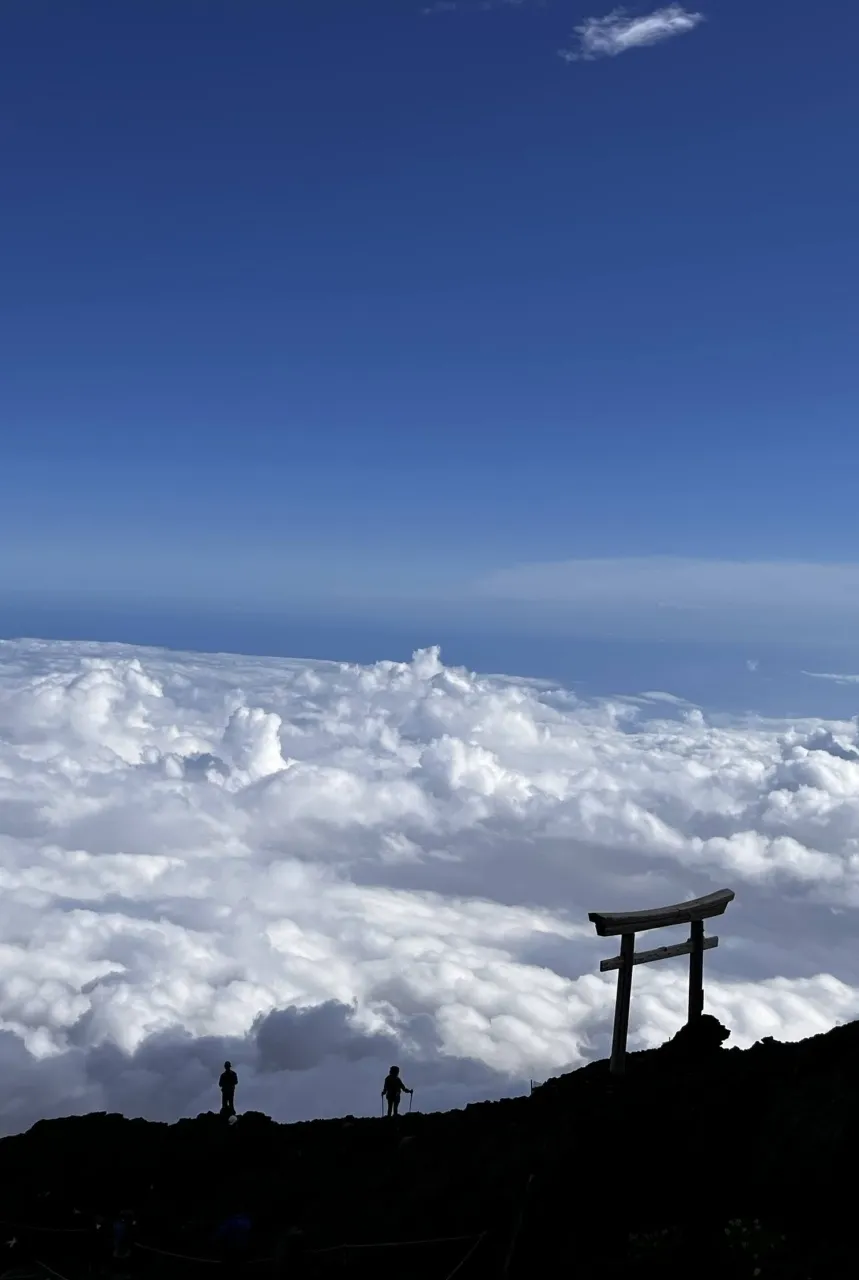 9.5合の山小屋を過ぎ、最後の難所「胸突き八丁」を超えると、山頂の鳥居が見えてきます。鳥居をくぐると富士宮ルートの10合目「富士山頂奥宮」に到着です。