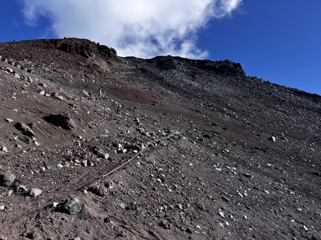 6合目を過ぎると本格的な登山道に入り、大小さまざまな火山岩が転がる斜面を登ります。バランスを崩して転倒しないよう注意しながら進みましょう。