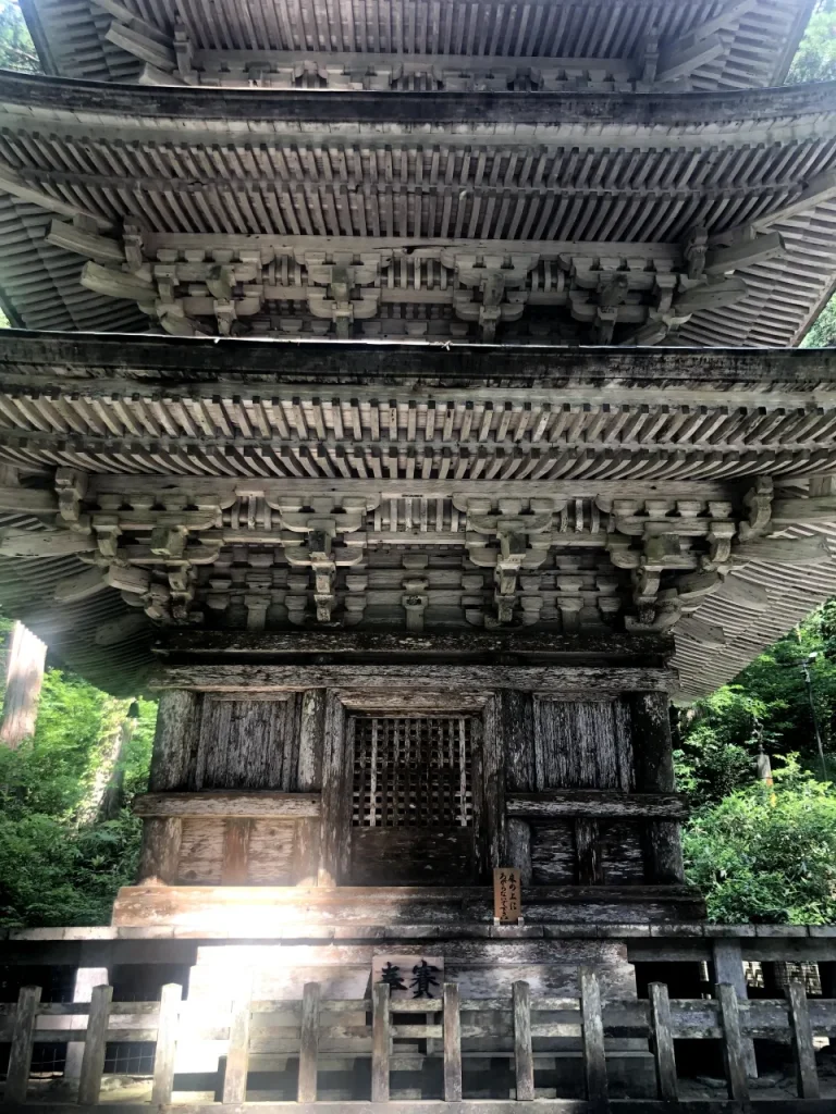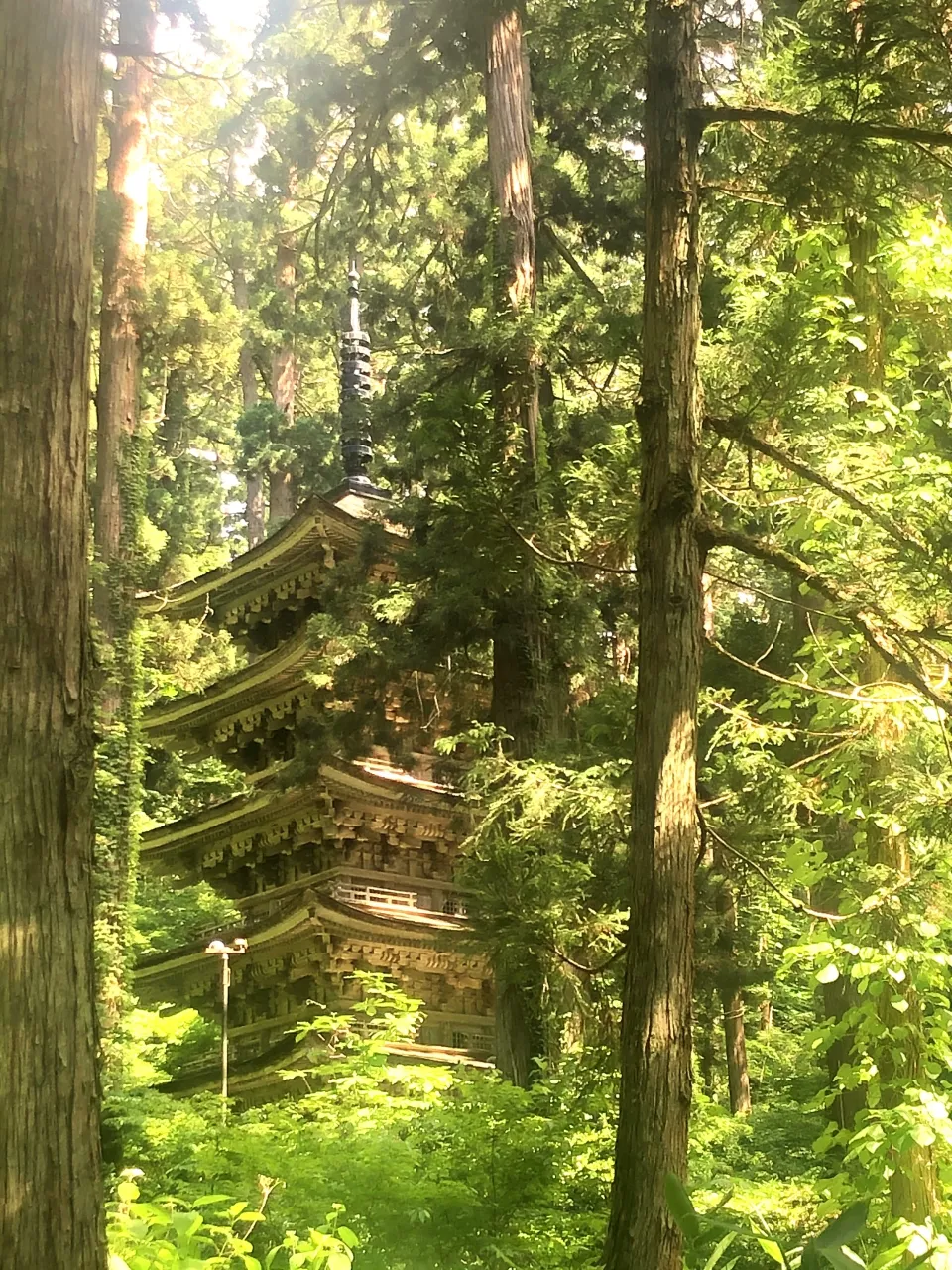 平安時代創建とされ、約600年前に再建された高さ29mの塔は、きらびやかな装飾や塗装がされない無垢な姿が周囲の自然と調和しているのが特徴。すぐそばには樹齢1,000年を超える「爺杉」もあり、長い年月にわたり共存してきた自然の巨木と人口の塔の姿に圧倒されます。