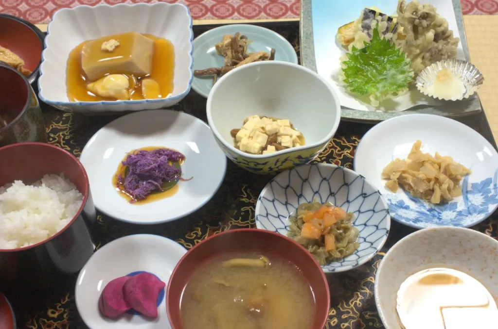 仏教やその影響を色濃く受ける修験道では肉食が避けられていたため、植物性の食物だけでも十分な栄養が摂取でき、味にも満足できるよう精進料理が寺院や宿坊で発展しました。