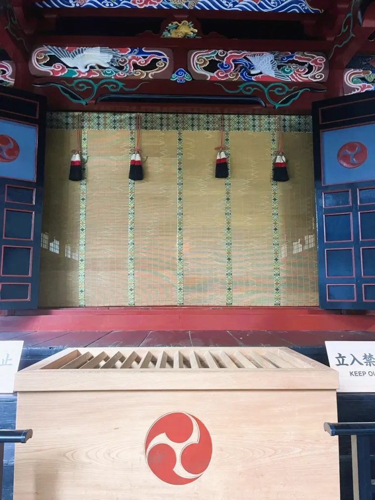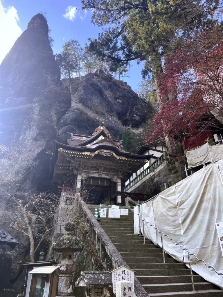 そうした特徴が最も感じられるスポットのひとつが、本殿手前の双龍門。その名が示すとおり龍の装飾があしらわれた木製の門と、背後にそびえる巨石の迫力ある光景は見る者を圧倒します。