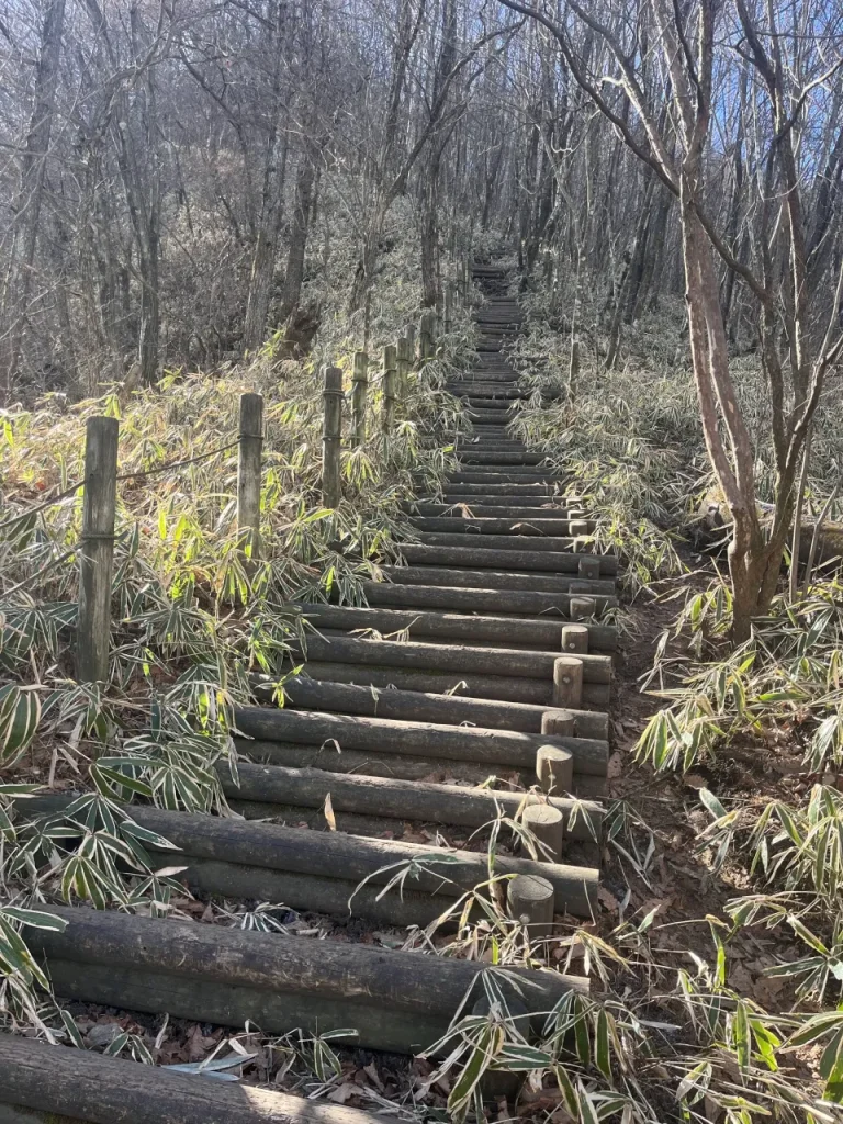 30分ほどで車道が現れるため、それを横断し、その先から再び登山道に入ります。この登山道の入口は分かりにくいため、GPSアプリを参考にするのがおすすめです。