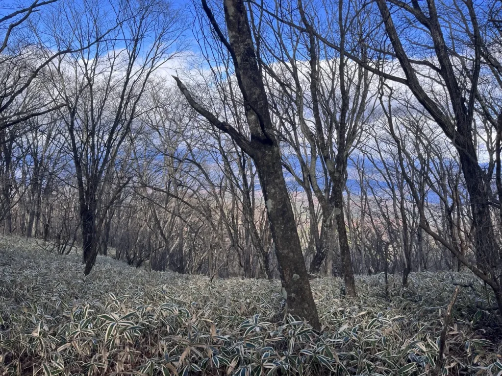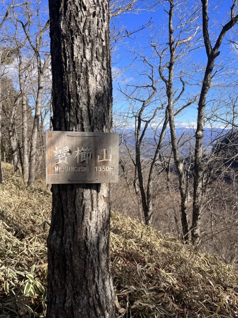 笹の茂る山道を、分岐から約30分ほど登れば鬢櫛山の山頂に到着します。