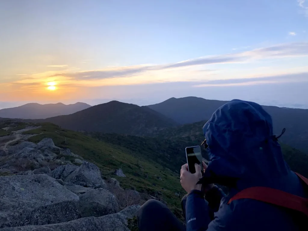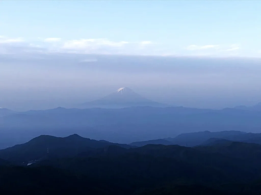 砂払いノ頭から約60分で山頂に到着。標高2,599mの山頂からは、東の空に昇る美しい朝日がながめられます。真っ暗闇のなか、険しい登山道を登ってきた努力が報われる瞬間です。