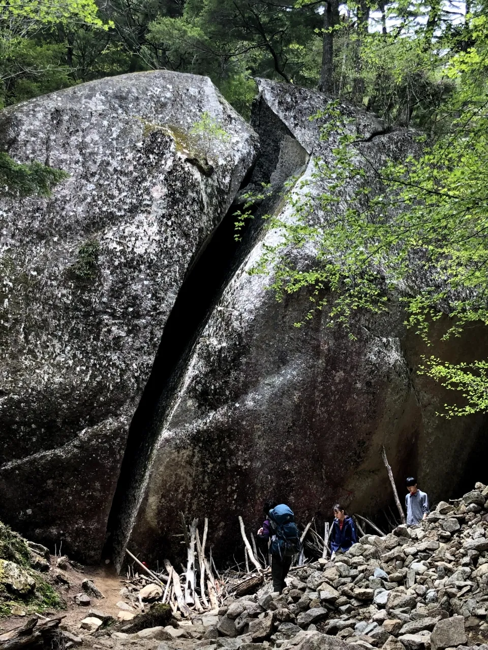 富士見平小屋から約30分ほどの下り道を歩き、谷底を流れる天鳥川(あまとりがわ)に到着。川を超えると桃太郎岩と呼ばれる大きな岩が現れます。刀で真っ二つに切られたような形状の直径約10mの巨石は、迫力がありますよ。