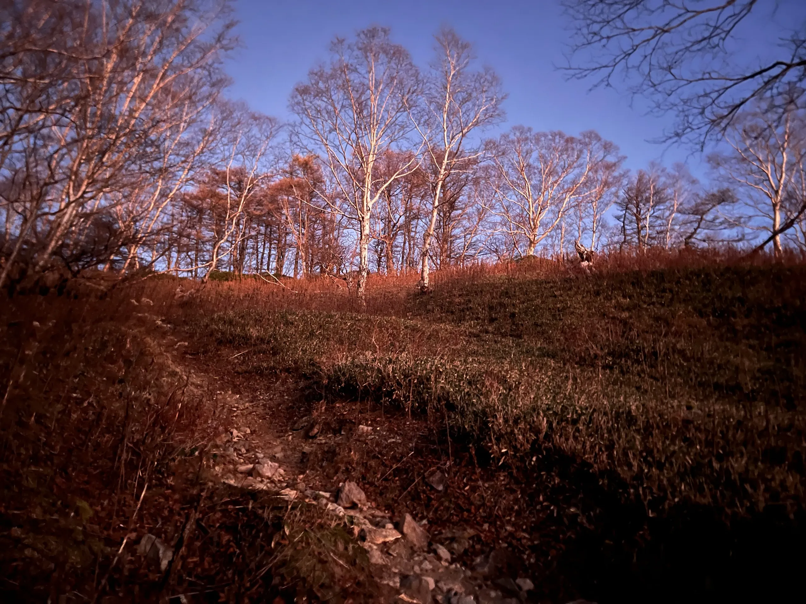 2時間半ほど登るとようやく急登も終わり、傾斜も緩やかになります。その頃には空も次第に明るくなり、周辺の木々が朝日に染まりはじめているでしょう。