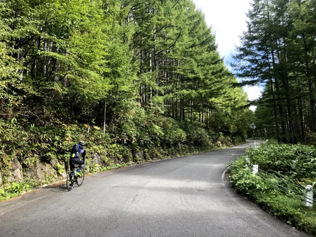 コースの前半は緑豊かな樹林帯に囲まれた峠道を走ります。しばらくはゆるやかな登りが続くため、バッテリー節約のためアシストは弱めに設定し、ゆっくりと高度を上げていきましょう。