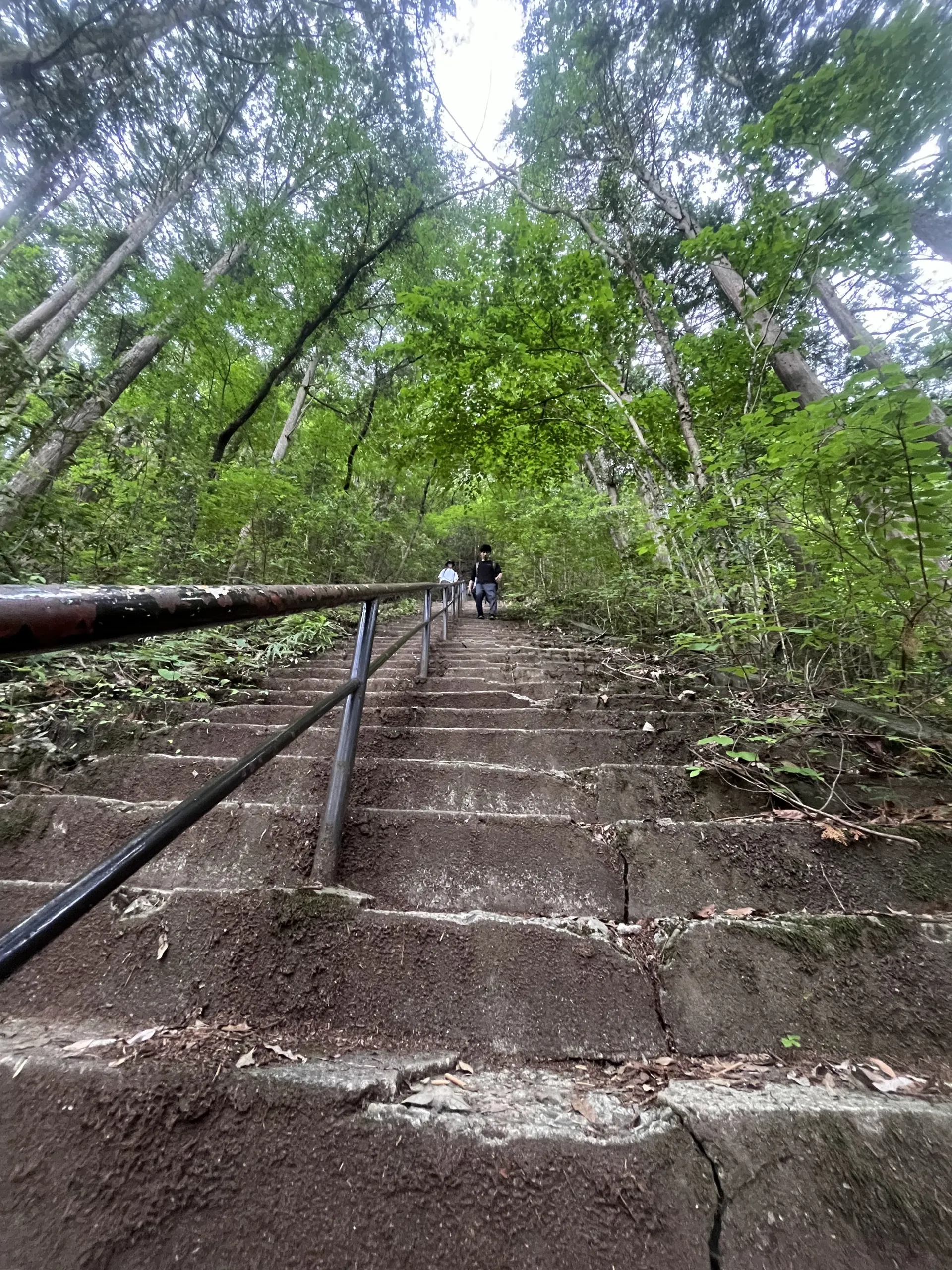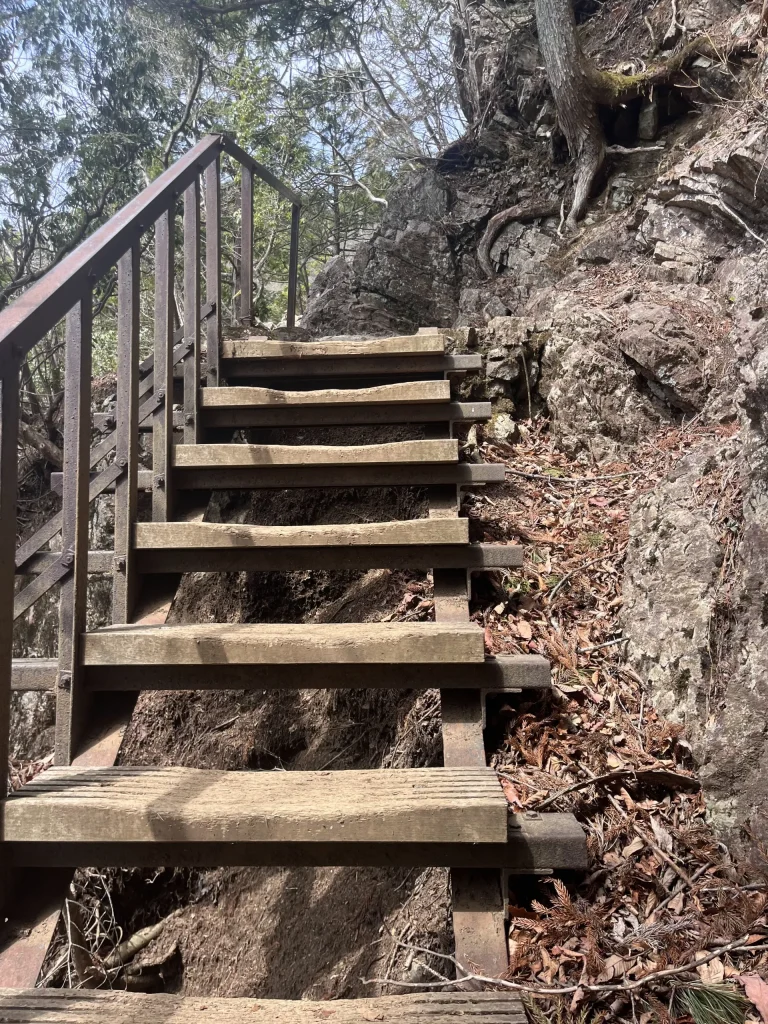 大岳山から複数の峰を経由しながら、奥多摩方面へと下っていきます。五重塔の立つ愛宕山を過ぎると、最後の難関として待ち構えているのが、約187段の大石段。