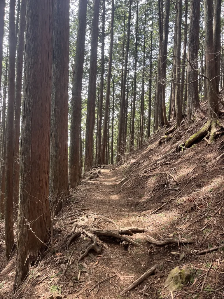 武蔵御嶽神社での参拝後はハイキングコースに戻り、杉並木の山道を歩きます。