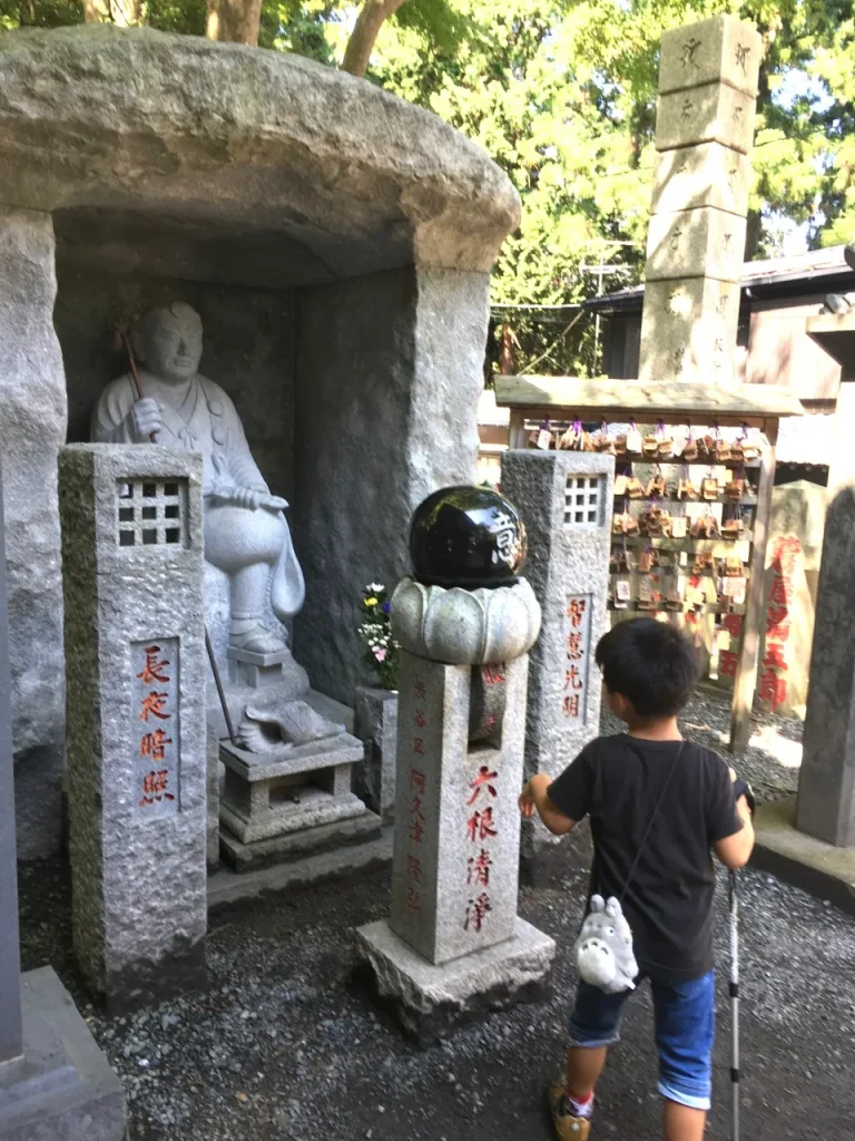 天狗の像と同様に山内でよく見かける丸い石がのった石柱は「六根清浄石車」と呼ばれるもの。丸石にはそれぞれ六感を意味する漢字が掘られており、その下の石車を回すことで心身が清らかになるとされています。
