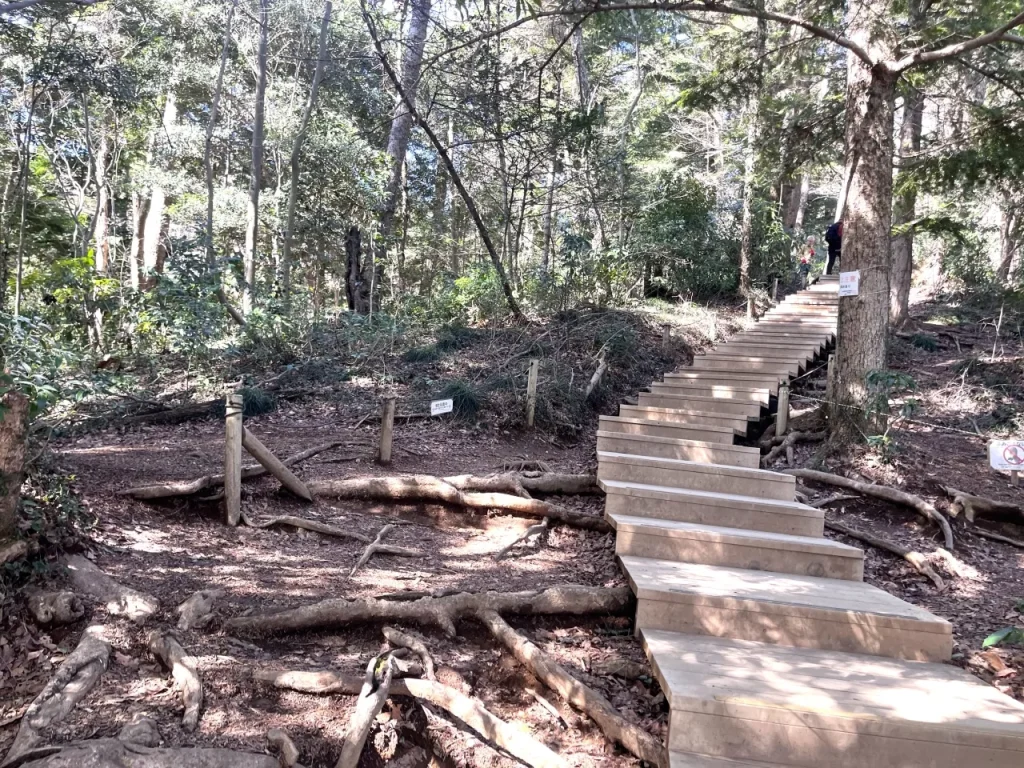 山頂まで続く木製の階段の道は非常に長く、これまでの登山で疲れた足にこたえます。休憩をはさみながら、少しずつ歩を進めましょう。
