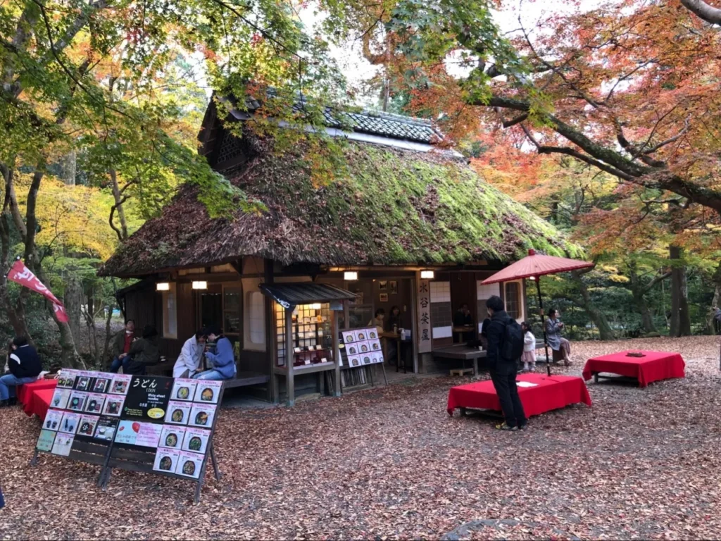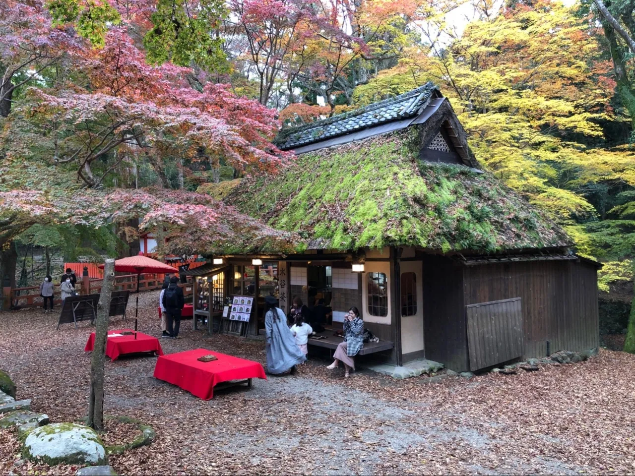 上記の写真は、春日大社付近にある水谷茶屋(みずやちゃや)です。ひっそりとした空間に茅葺き屋根の茶屋がポツリと構えており、紅葉と落ち葉に囲まれているその様子はまさに神秘的です。