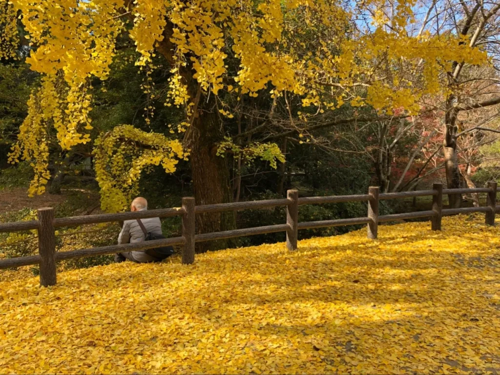 続いては、二月堂を出て少し進んだところにあるイチョウ。垂れ下がるイチョウと地面を埋め尽くす黄色いじゅうたんが造り出す空間は、思わず足を止めてしまうほどの絶景です。