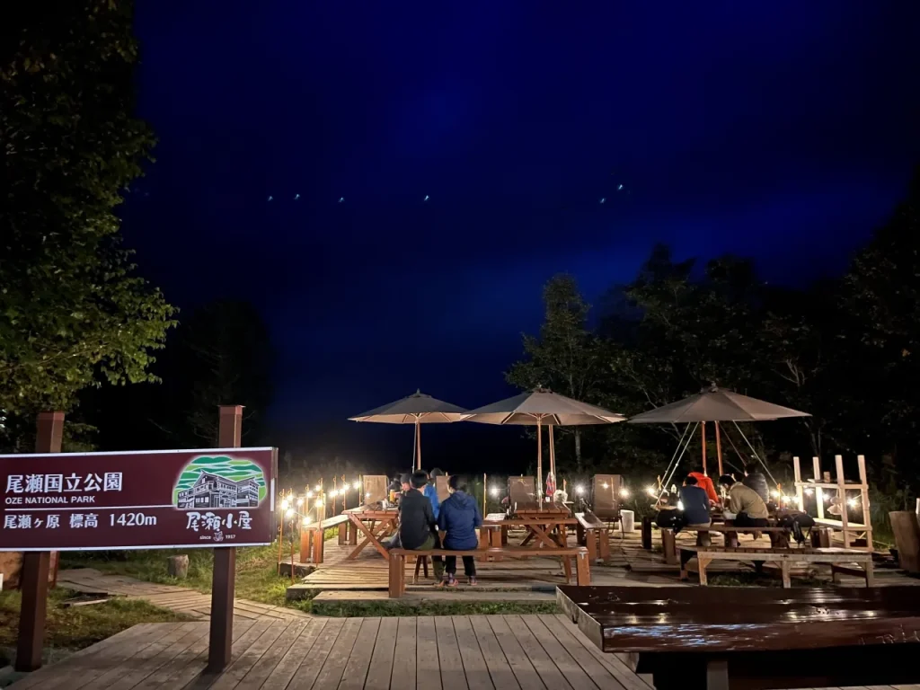 もう少し夜の時間を楽しみたい。そんな二人はぜひ、尾瀬小屋のレストランへ足を運びましょう。テラス席で星空と夜の湿原を眺めながら、美味しいお酒や食事がいただけます。