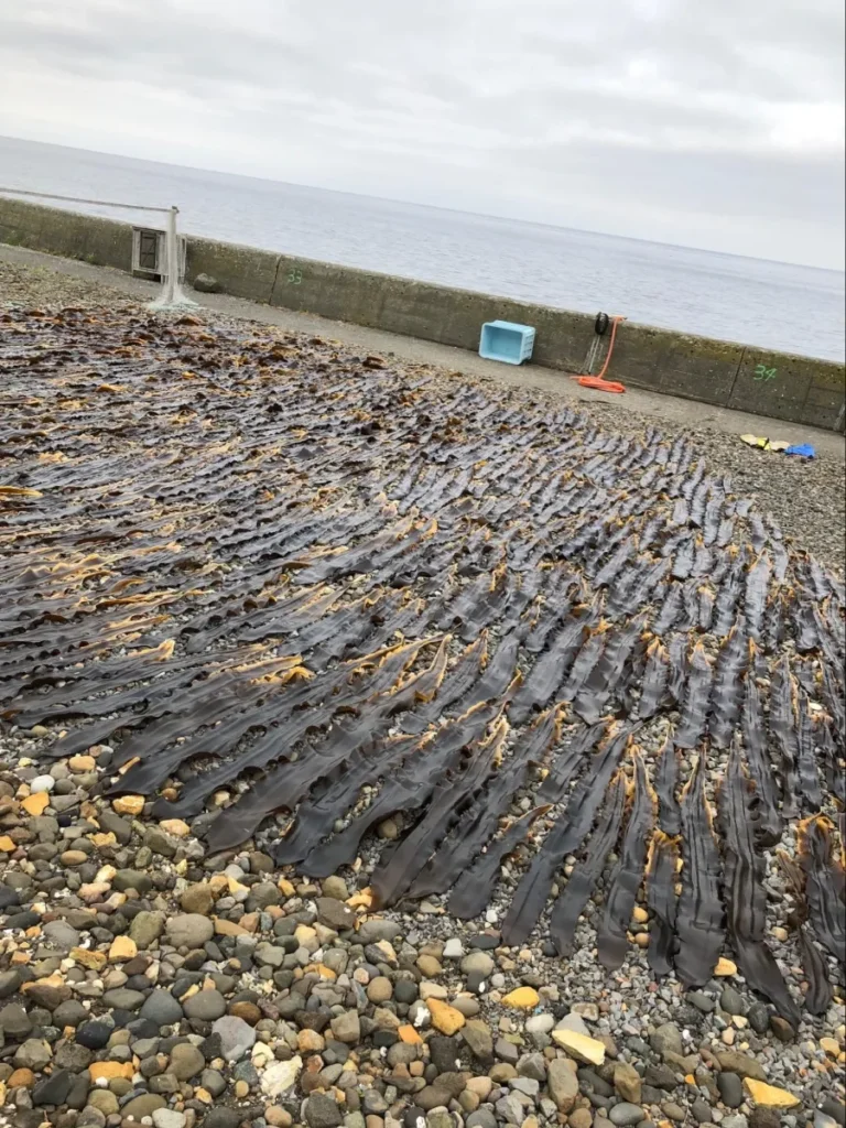 こちらはサイクリング中に見つけた、利尻昆布が干されている様子。礼文島では7月下旬から昆布漁が始まり、獲った昆布を家族で干す作業が夏の風物詩となっています。