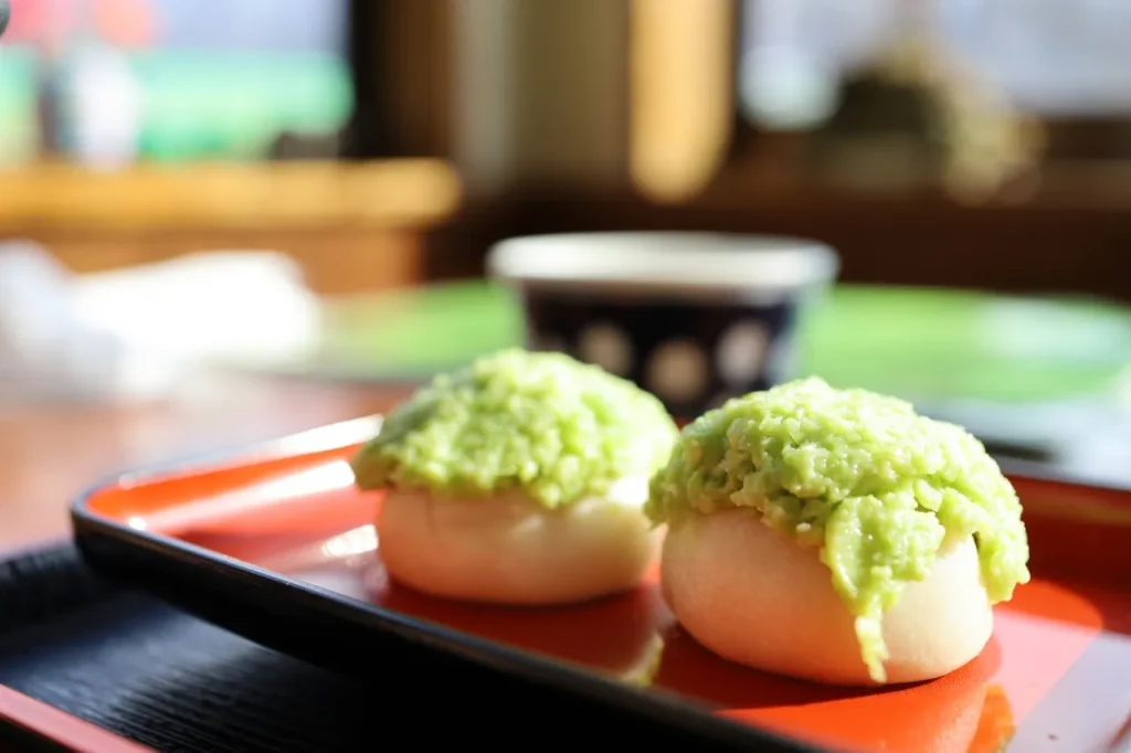 グルメのなかでも特におすすめなのが、生麹ずんだ餅です。和菓子の道明寺を生麹で包みこみ、蒸した後にたっぷりのずんだ餡をのせています。