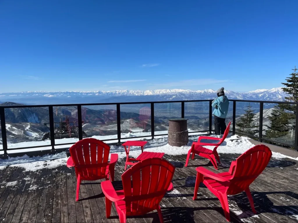 またゴンドラ乗り場の東館山頂駅には展望スペースが設けられており、標高2,000メートルからホワイトに染まる北アルプスを一望できます。休憩ついでに、目の前に広がる絶景も楽しんでみては。